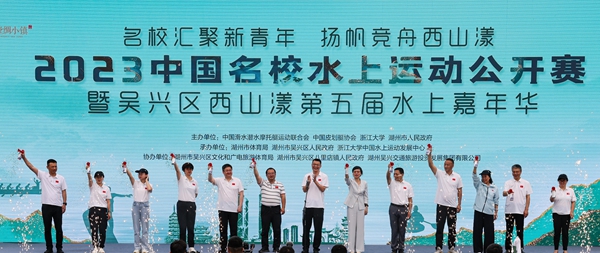 近日,“名校汇聚新青年 扬帆竞舟西山漾”2023中国名校水上运动公开赛暨吴兴区第五届水上嘉年华活动在西山漾拉开帷幕。我校副校长舒志定受邀出席开幕式,并为本次比赛鸣笛开赛。