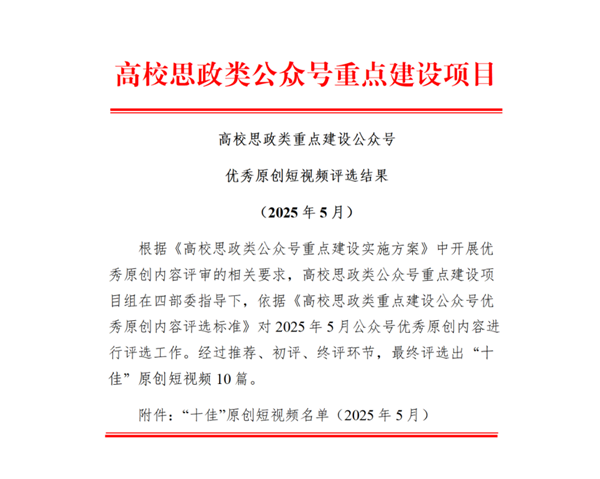 根据《高校思政类公众号重点建设实施方案》中开展优秀原创内容评审的相关要求,7月24日,高校思政类公众号重点建设项目组在中央宣传部、中央网信办、教育部、共青团中央四部委指导下,对162家建设单位推荐的470件作品开展2025年3月至5月公众号优秀原创内容评选工作。我校“湖师青年1958”全媒体工作室报送的《湖小狮周记》首次入选“十佳”原创短视频。